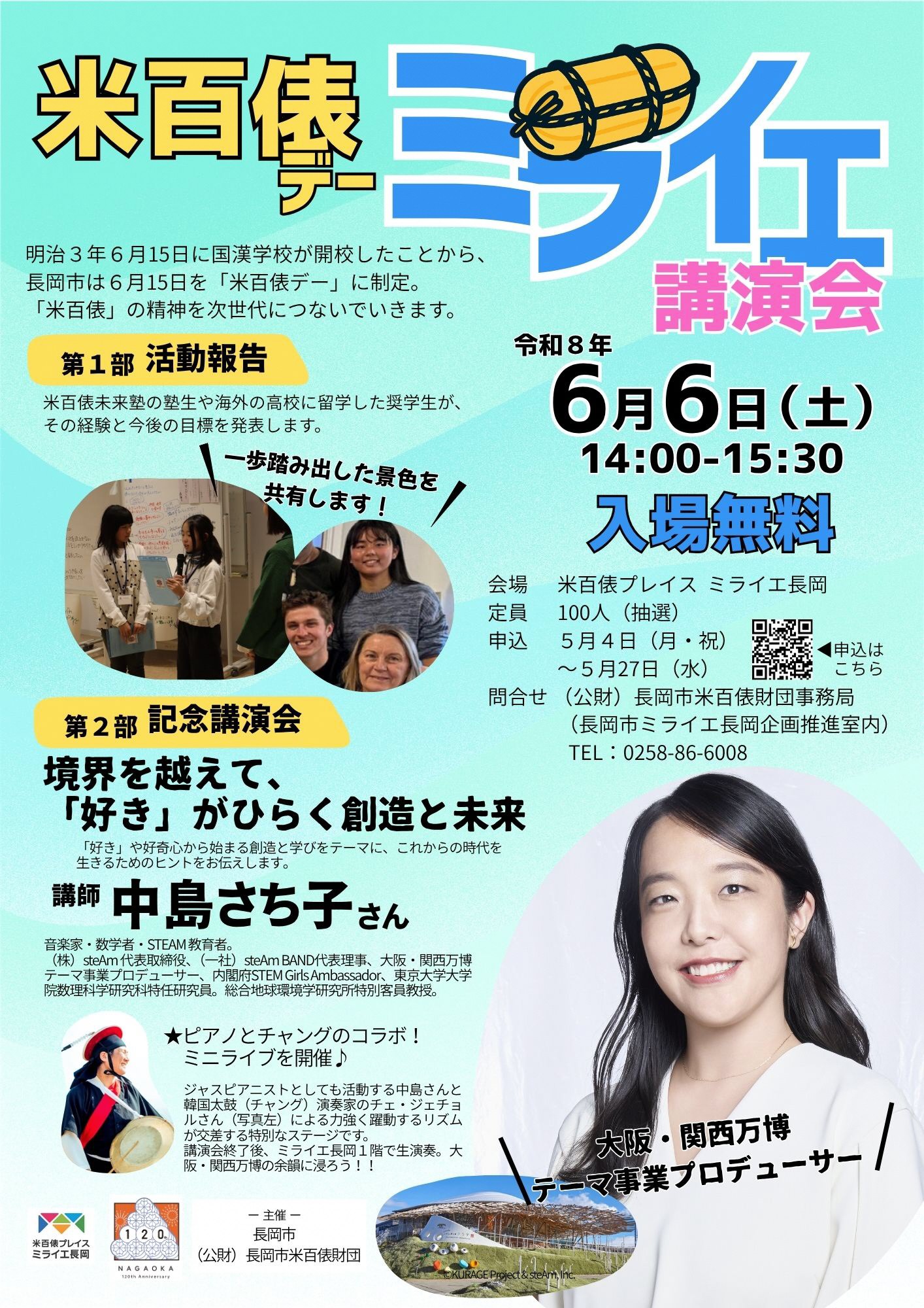 ジャズピアニストとしても活動する中島さんと韓国太鼓(チャング)演奏家のチェ・ジェチョルさんによる力強く躍動するリズムが交差する特別なステージです。講演会終了後、ミライエ長岡1階で生演奏します。